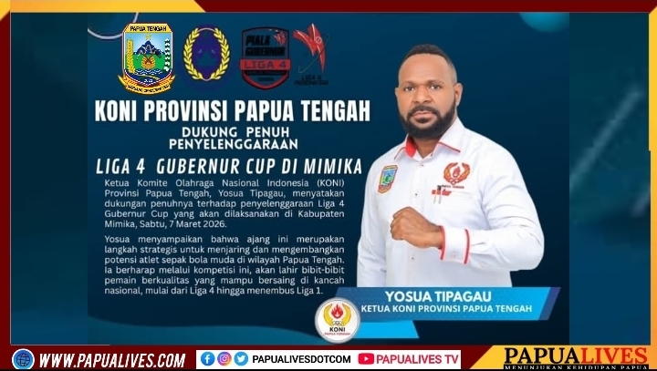 MIMIKA – Ketua Komite Olahraga Nasional Indonesia (KONI) Provinsi Papua Tengah, Yosua Tipagau, menyatakan dukungan penuh terhadap penyelenggaraan Liga 4 PSSI Piala Gubernur yang akan digelar pembukaan pada 8 Maret 2026 di Kabupaten Mimika. Dikatakan Yoti, Sabtu (7/3/2026) kemarin.